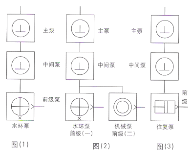 臺(tái)羅茨泵串聯(lián)再與水環(huán)泵組合,就能大大提高機(jī)組的極限壓力(可達(dá)25P a)。故在這種類型里通常見到的是兩臺(tái)羅茨泵串聯(lián)后再用雙級(jí)泵作前級(jí)泵(圖1)組成機(jī)組。如果需要更高的極限壓力,可用三臺(tái)羅茨泵與水環(huán)泵組合,它的極限壓力可達(dá)1Pa。